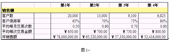 我们来设想,通过市场营销战役第1年我们获得了一批客户,产生了交易,其中有一组客户数为20,000个,如图1所示。