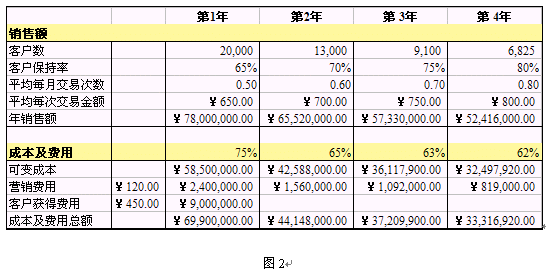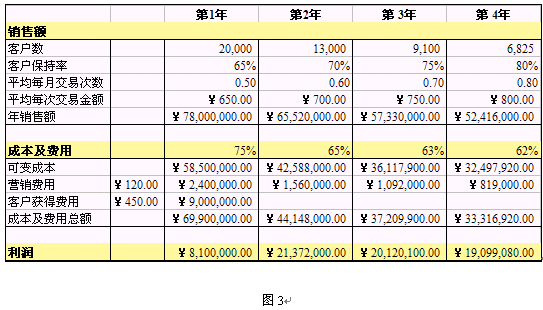 第1年,平均每个客户每个月交易的次数是0.50次,平均每次的交易金额是¥650.00,因此第1年的销售额是¥650.00*(0.5次/月*12个月)*20,000 = ¥78,000,000.00。随着时间的推移,保留下来的老客户平均每个月的交易次数逐步从0.50次上升到0.80次,而且每次采购的金额也逐步从¥650.00提高到¥800.00;但是由于这一组客户的数量不断减少,年销售额逐步从¥78,000,000.00下降到了¥52,416,000.00。