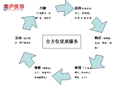 在SONY,客户的服务不仅仅是客户服务一个部门的工作,它贯穿于客户从给SONY接触开始的各个阶段。只有让客户在各个阶段都得到满意,才算是优质的服务,正如下图所述: